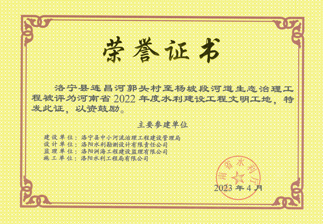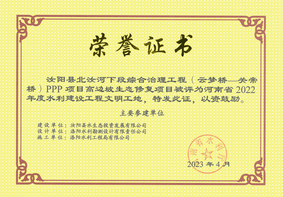 近段時(shí)間以來,公司喜訊連連,先后收到省水利廳、水利學(xué)會(huì)頒發(fā)的多份榮譽(yù)證書和獎(jiǎng)杯。其中,洛寧縣連昌河郭頭村至楊坡段河道生態(tài)治理工程和汝陽縣北汝河下段綜合治理工程(云夢橋—關(guān)帝橋)PPP項(xiàng)目高邊坡生態(tài)修復(fù)項(xiàng)目2個(gè)項(xiàng)目被河南省水利廳評(píng)為河南省2022年度水利建設(shè)工程文明工地;洛陽市洛河?xùn)|湖攔河壩工程喜獲河南省水利工程建設(shè)“紅旗渠杯”首批優(yōu)質(zhì)工程榮譽(yù)稱號(hào)。