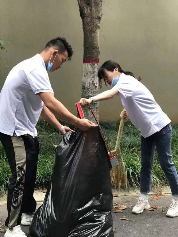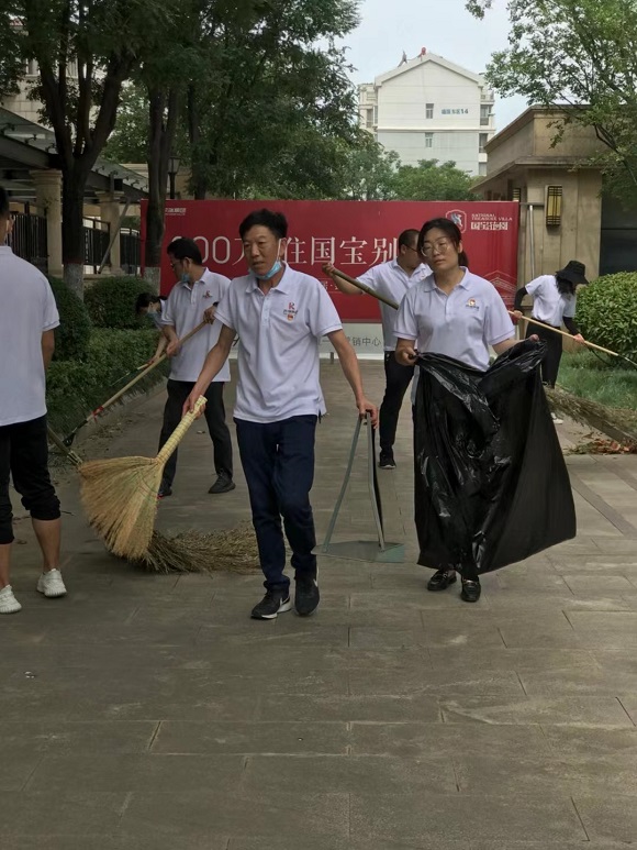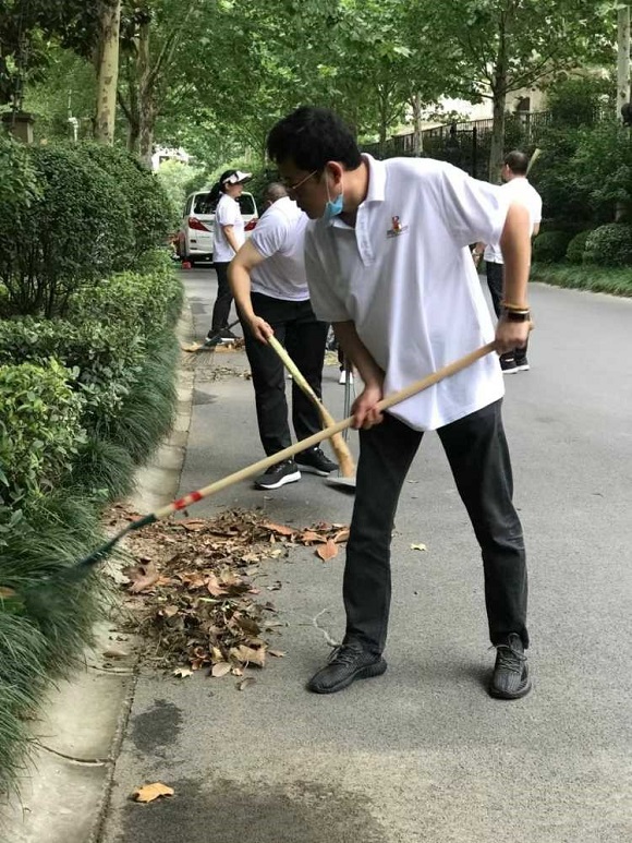集團一組黨員與酒店公司黨員前往物業公司,在物業公司保潔主管的分配指揮下,“變身”為保潔員深入物業公司國寶花園管理處一線,切身體驗物業基層崗位的工作,大家手執草耙掃帚塵推抹布等保潔工具,清理園區綠化帶及主干道的枯枝落葉和果皮紙屑,沖洗路面塵土,打掃法郡地庫洗地車無法進入的衛生死角,有效協助管理處在保潔崗位人員緊張的情況下分擔了部分重點區域的工作。當天室外體感溫度超35度,大家的衣衫一直被汗水浸濕,額頭的汗水更是不停的滑落,但在場的所有黨員同志毫無怨言,堅持工作。